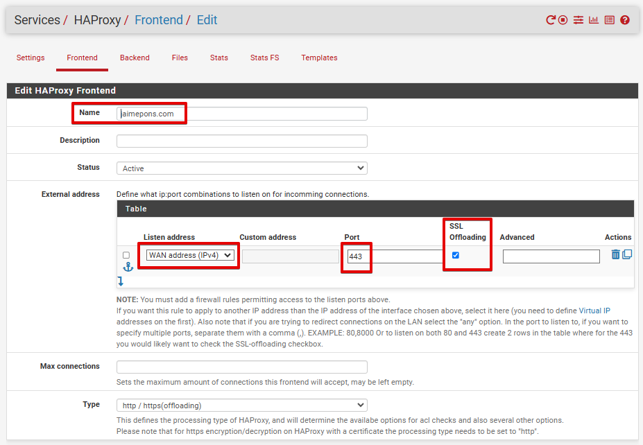 Vamos a la pestaña Frontend, creamos uno nuevo y configuramos varias partes. La primera es la IP de escucha (WAN Address), el puerto (443) y el SSL Offloading, es decir, forzamos a que la conexión SSL cliente-servidor termine en el HAproxy (por eso hemos instalado el certificado wildcard *.jaimepons.com aquí). El Name puede ser cualquier cosa.