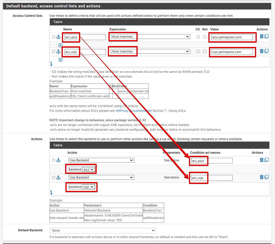 Los Frontend son los puertos de escucha (en nuestro caso el 443 de HTTPs), sobre los que analizarás las peticiones que hagan los usuarios (la web a la quieren acceder), y en base a unos “filtros” (¿quiere ir a azul.jaimepons.com o a rojo.jaimepons.com?) podrás enlazar dichas peticiones con determinados backends.
