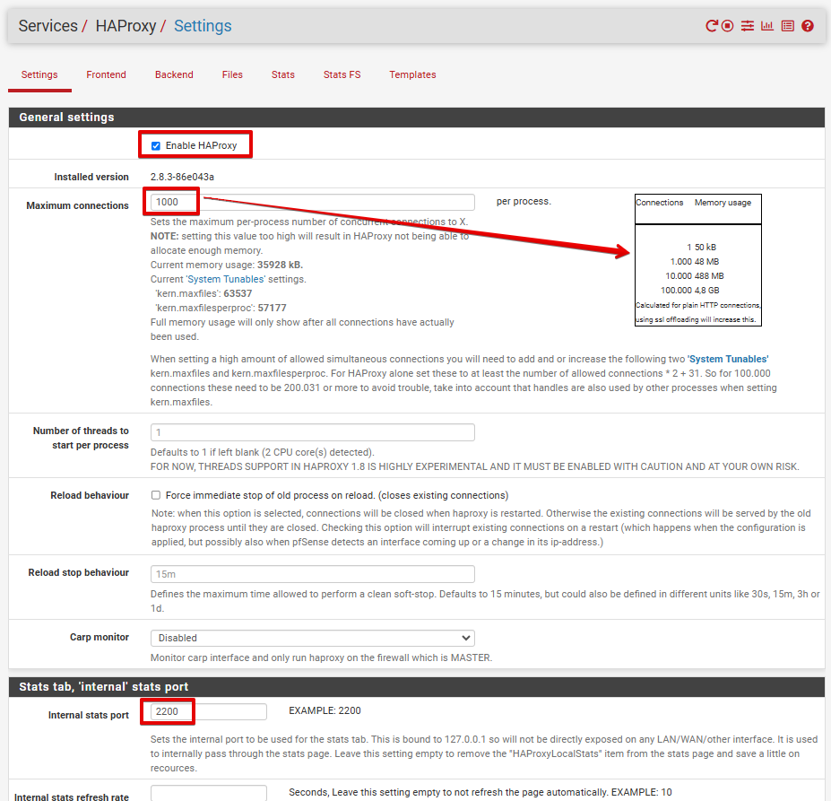 Vale, ya tenemos configurados el Frontend y los Backend, ahora falta el último paso, ¡activar HAproxy!, establecer las conexiones máximas por proceso y activar las estadísticas (suuuuuper interesante): Abre Setting y configúralo