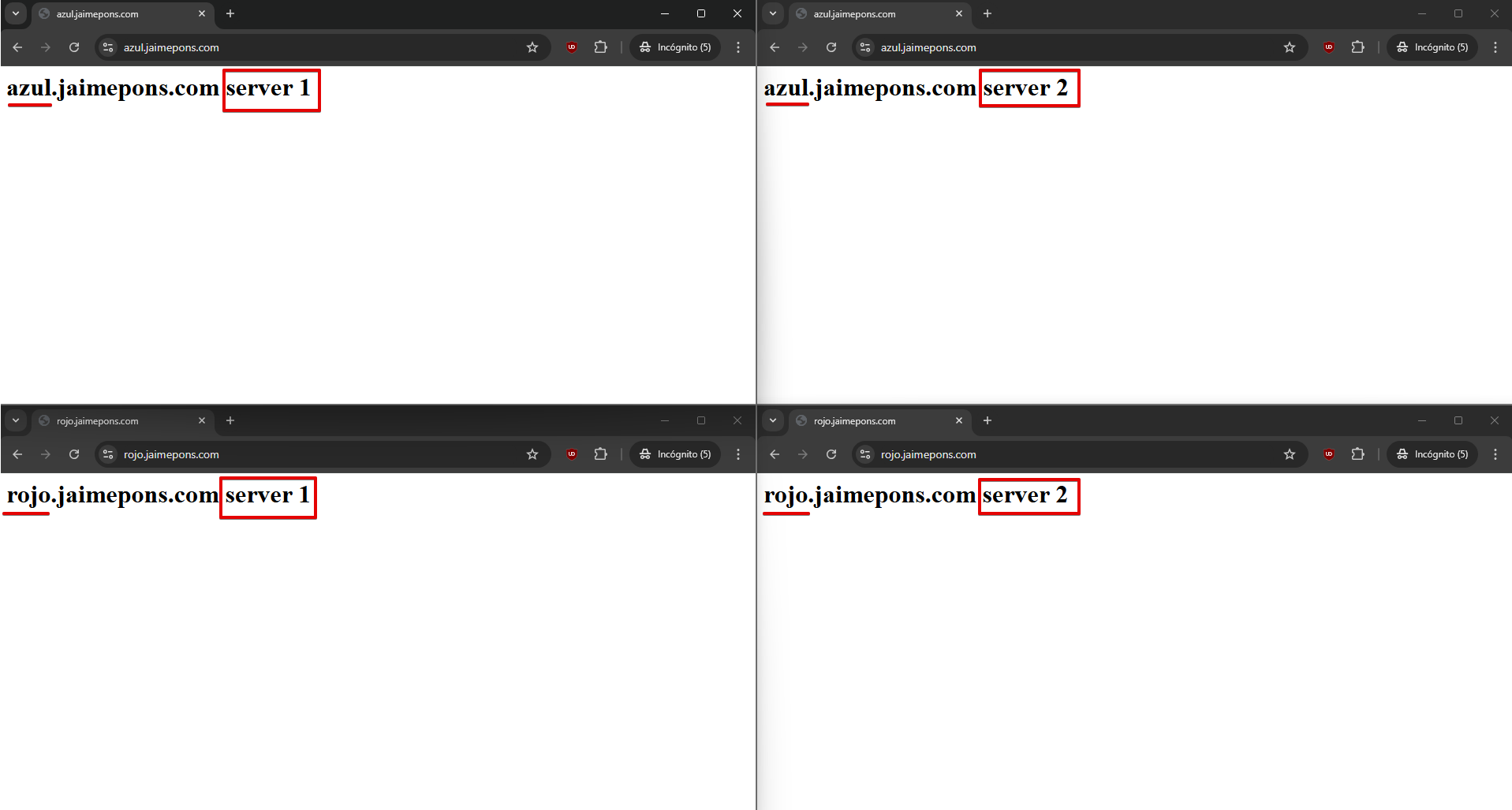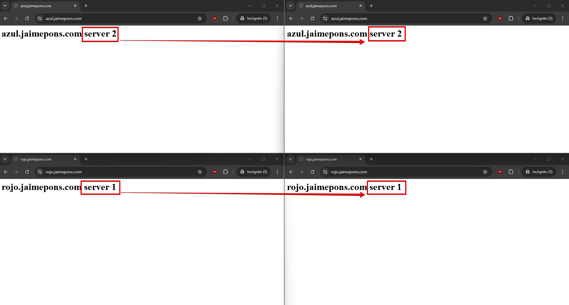 En nuestro ejemplo, trabajaremos con el dominio principal jaimepons.com (sí, ya sé ya sé, pero no tengo otro disponible que no utilice), y según el subdominio que soliciten los usuarios, los redirigiremos a un servicio o a otro. En nuestro ejemplo trabajaremos con dos subdominios: rojo.jaimepons.com y azul.jaimepons.com