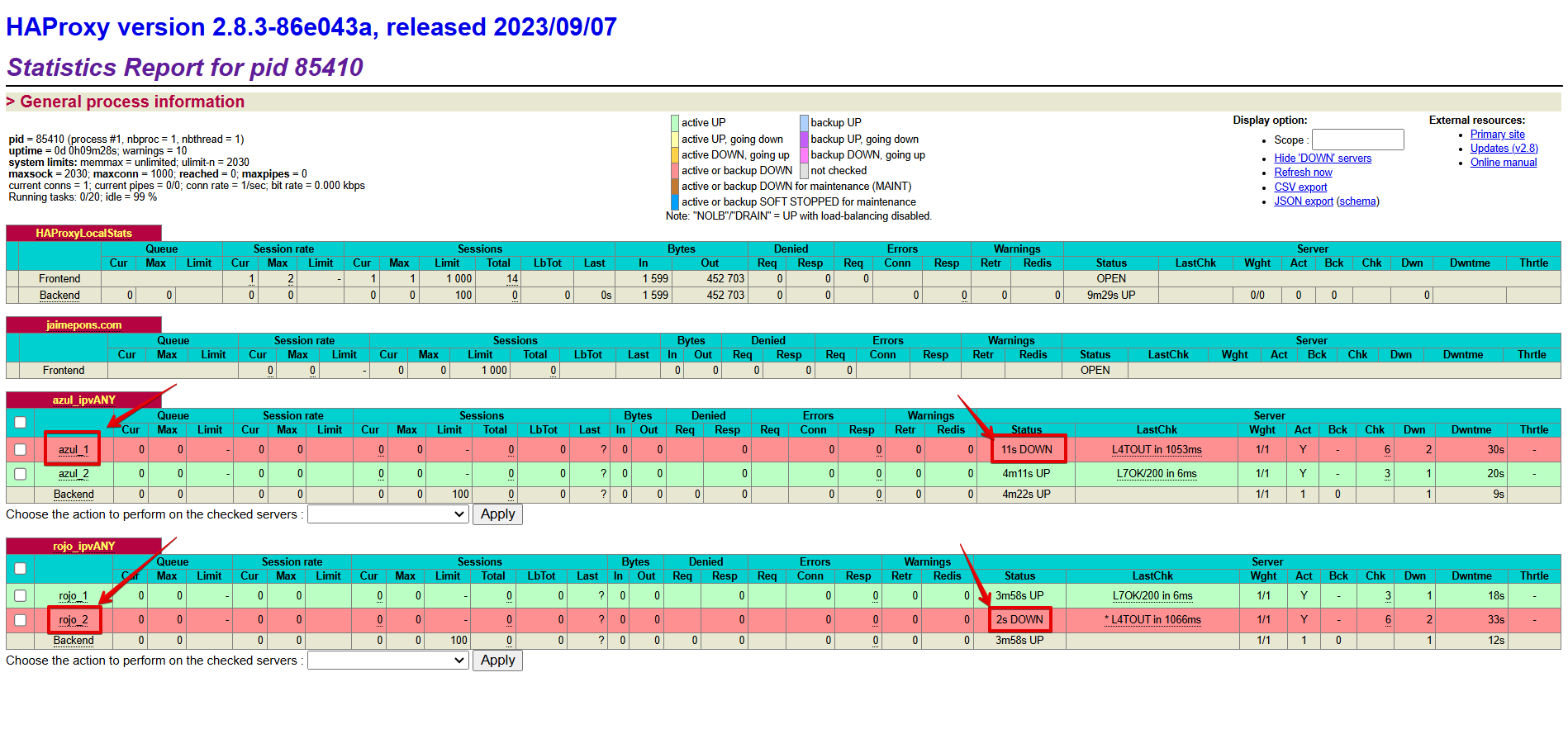 Fijaos que hay un “Check”. Ese Check lo que hace por defecto HAproxy es validar cada segundo que el servidor web esté activo y respondiendo. Si en algún momento un servidor se “cae”, ya no lo tendrá en cuenta a la hora de enviar peticiones y las peticiones se distribuirán entre los servidores que aún estén disponibles.
