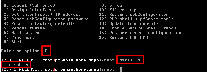 Para ello, deshabilitamos un momento el firewall de pfsense desde la consola: