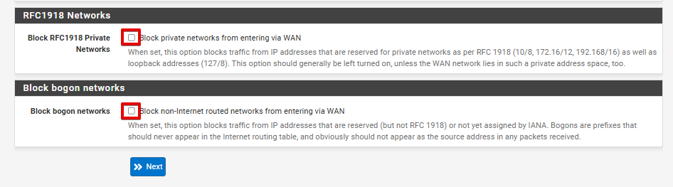 Seguimos el asistente inicial configurando hostname, dns, servidores de hora, etc. Cuando lleguemos al adaptador WAN (que estará configurado en IP estática) debemos desmarcar estas opciones para que no nos autobloqueemos al acceder: