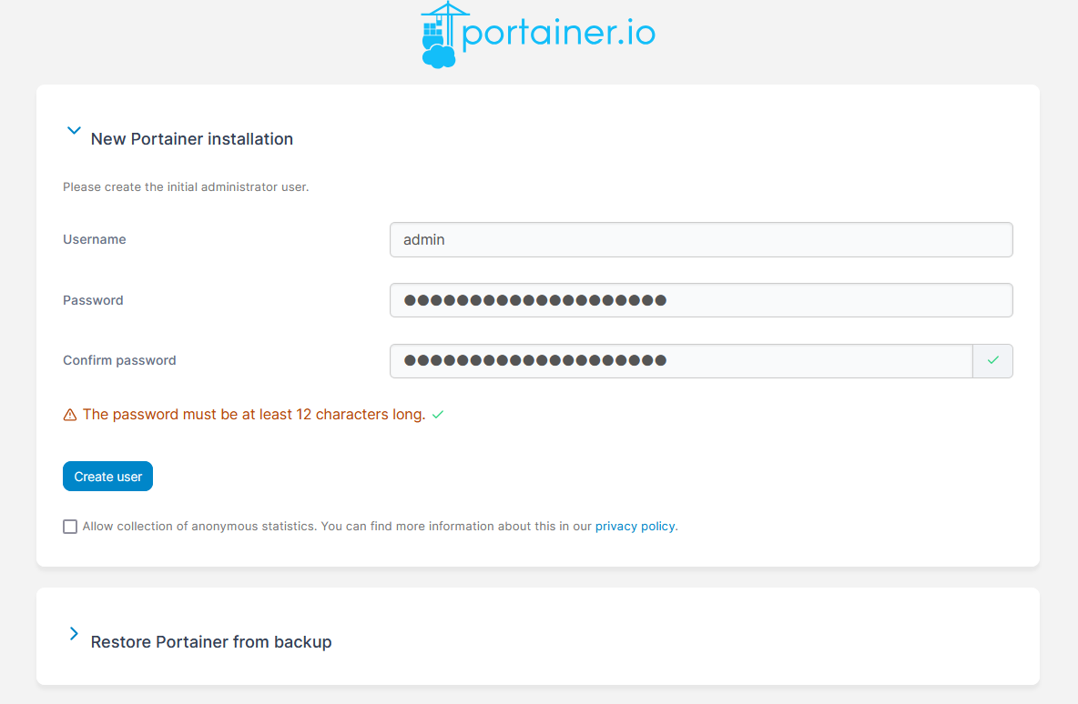 - La primera vez que accedas, Portainer te solicitará que configures una contraseña para el usuario administrador.