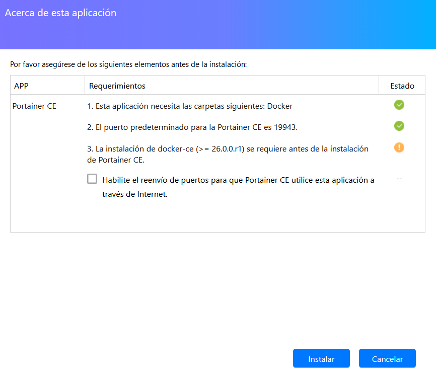 - Una vez instalado, busca Portainer en el menú de aplicaciones de ADM.
