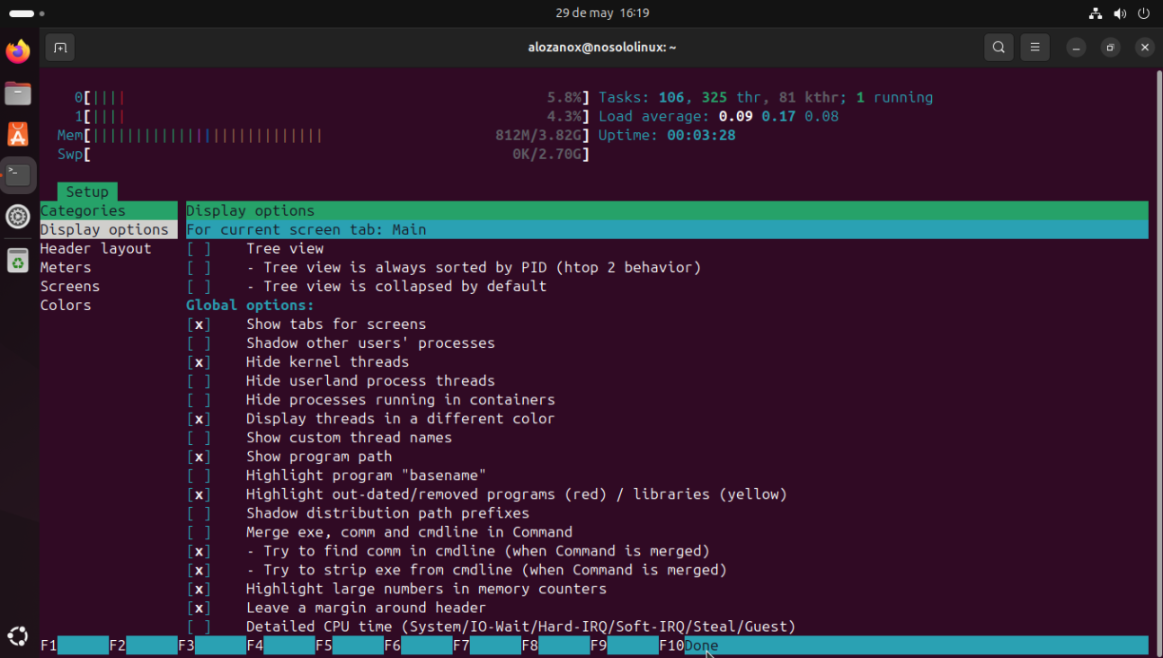 Una de las grandes ventajas de htop es que puedes personalizar su apariencia y funcionalidad. Presiona F2 para acceder al menú de configuración: