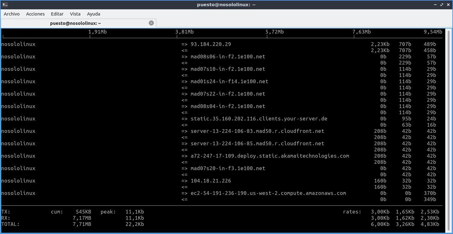 Como se puede observar en la imagen, aparecen las conexiones activas entre la máquina Linux «nosololinux» y diferentes direcciones IP.