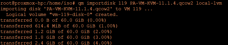 Reemplaza <VMID> con el ID de la VM que creaste, /ruta/destino/imagen.qcow2 con la ruta donde subiste la imagen, y <storage> con el nombre del almacenamiento en Proxmox donde deseas almacenar el disco y comenzará el proceso.