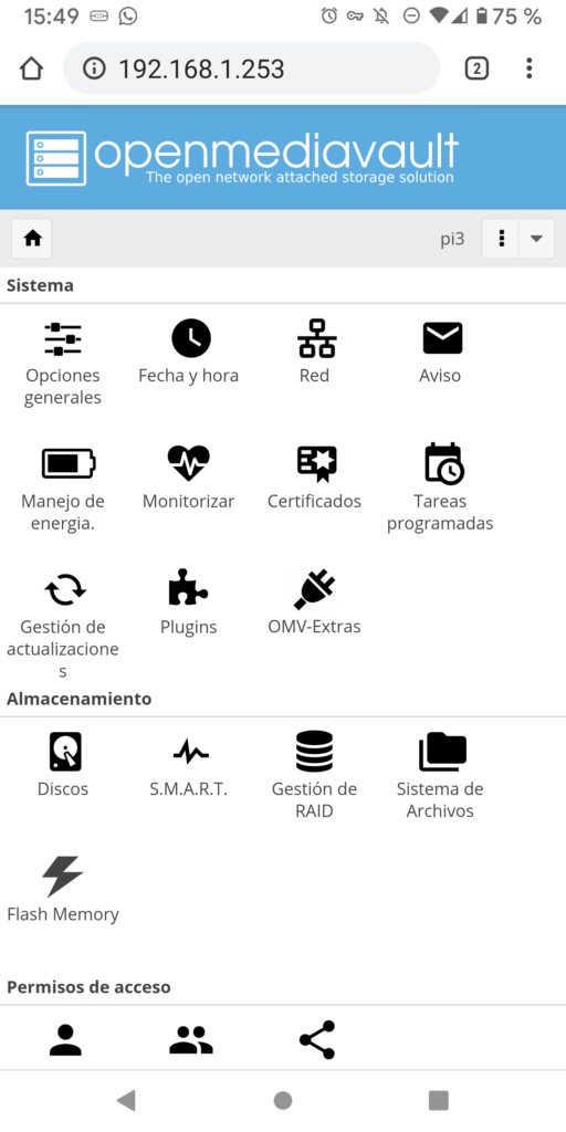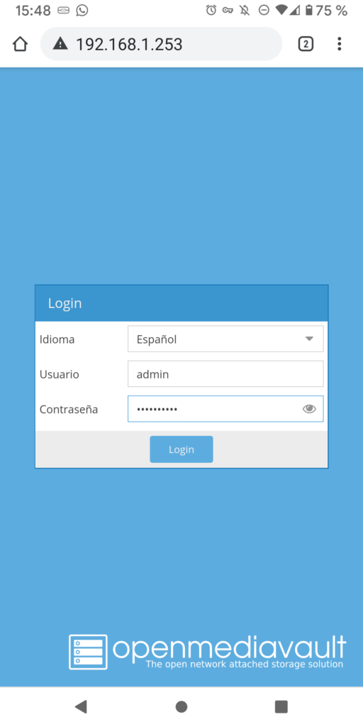 Tras el reinicio ya podremos acceder a nuestro NAS casero a través de la interfaz web poniendo la IP de la Raspberry en el navegador e introduciendo el usuario admin y la password openmediavault