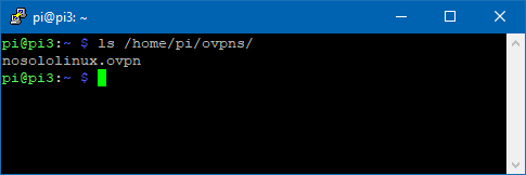 Una vez creado se nos generará el fichero que deberemos importar al cliente de OpenVPN. Se encuentra en la ruta /home/pi/ovpns/