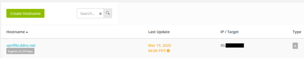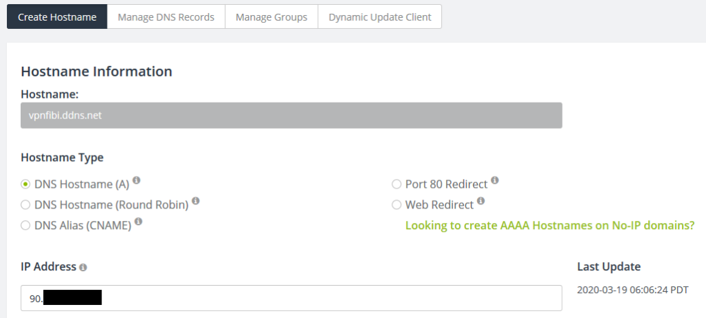 Ejemplo de configuración de nuestro hostname en NO-IP. Aseguraros que el type es DNS > A