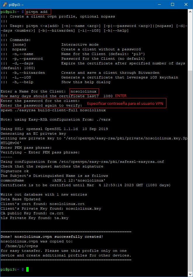 Como podéis observar una vez introducido el comando pivpn add nos solicita un nombre para el usuario, la vigencia de este usuario para el servidor y una contraseña.