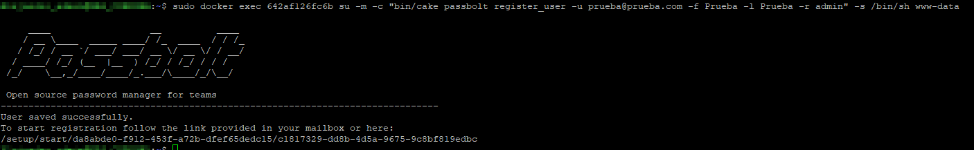 sudo docker exec "docker_ID" su -m -c "bin/cake passbolt register_user -u "Correo asociado" -f "Nombre" -l "Apellido" -r "rol_definido""-s /bin/sh www-data
