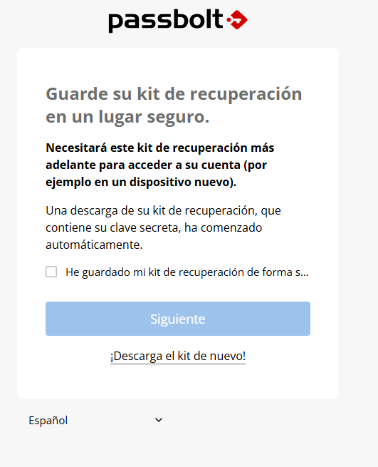 En la siguiente imagen, se puede ver que os descarga de forma automática un kit de recuperación. Es importante que este kit, se guarde de forma segura y que no se pierda. Una vez que lo tengas guardado, tendras que habilitar la casilla de «He guardado mi kit de recuperacion de forma segura» y darle a siguiente.