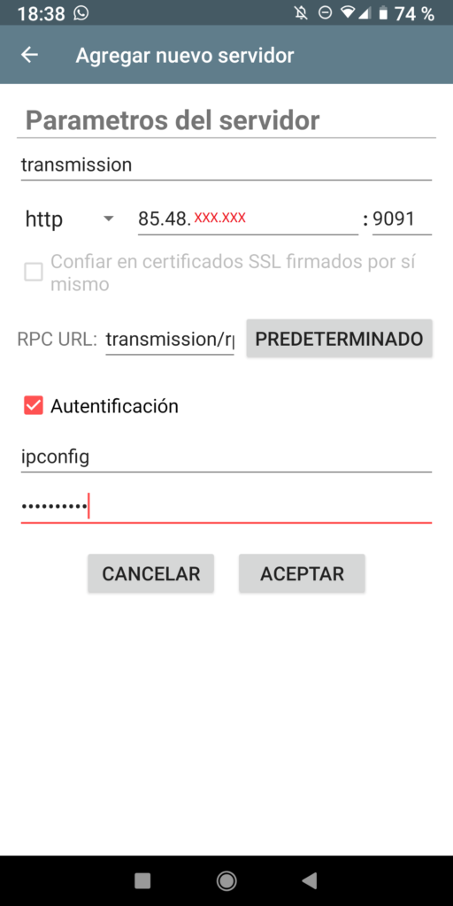 PASO 3 (Opcional): Por último, también podemos configurar la app Tranmission Remote para Android y así realizar las descargas de forma mas rápida y sencilla.