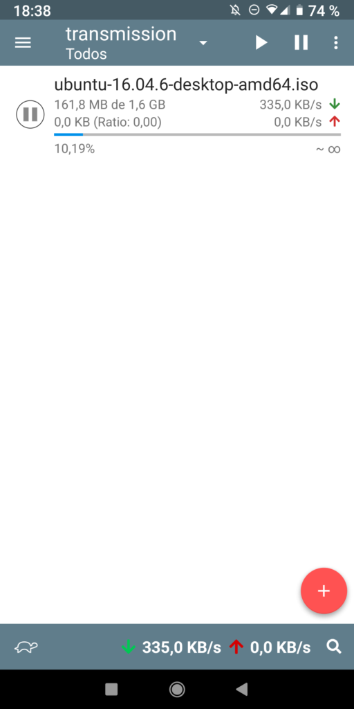 Una vez iniciamos la sesión en Transmission podemos visualizar todos los torrents activos además poder añadir nuevos, eliminarlos…
