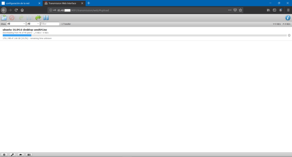 Una vez nos hayamos logado en la aplicación visualizaremos la interfaz de la aplicación Transmission y podremos añadir los torrents que queramos: