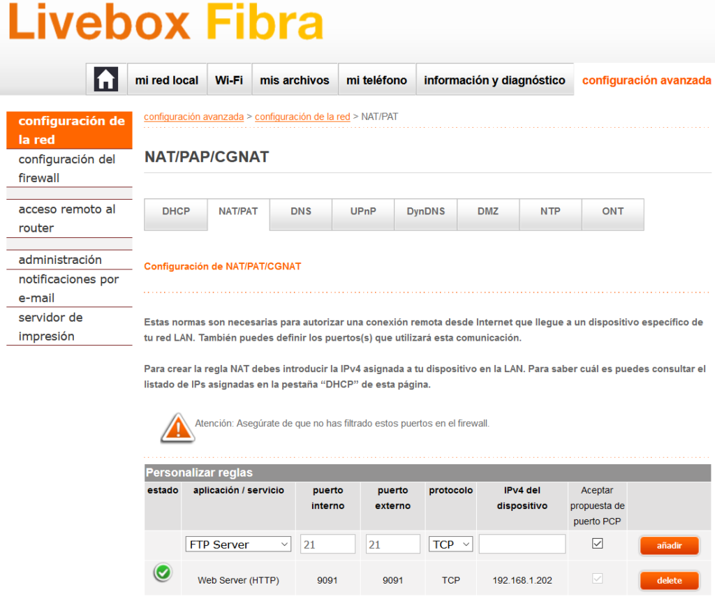 En la siguiente imagen crearemos la regla que permita el tráfico desde Internet a la IP de nuestra Raspberry (192.168.1.202 en este caso) a través del puerto externo 9091.