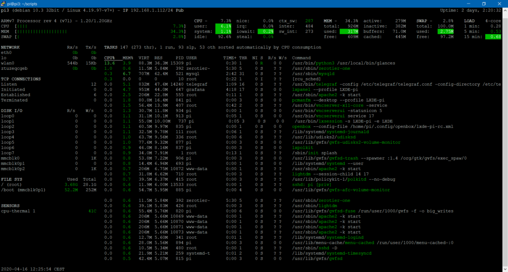 Como podéis observar nos proporiconará información acerca de la CPU, RAM, SWAP, tráfico en nuestras interfaces de red, número de conexiones activas, espacio libre, escritra y lecturas de discos, temperatura, procesos…