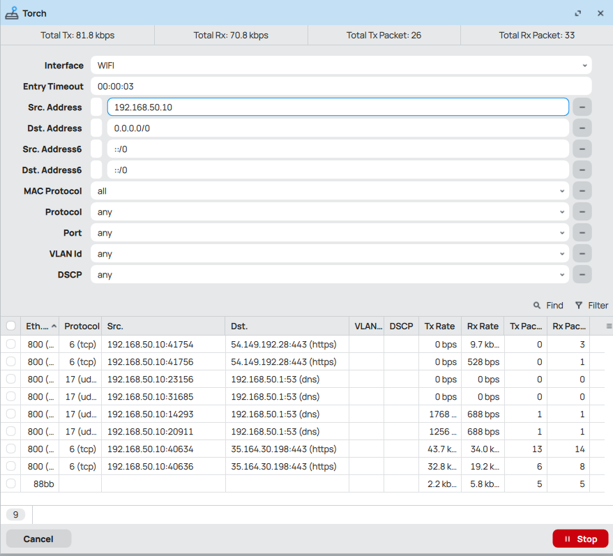 /tool torch interface=WIFI src-address=192.168.50.10 port=443