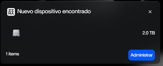 Tras el reinicio, ZimaOS verá el disco como un dispositivo VirtIO y podrá gestionarlo directamente.