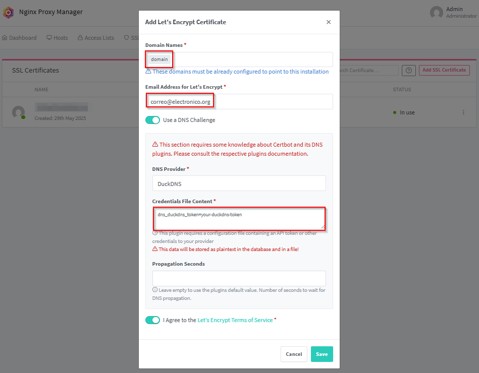 Puedes combinar DuckDNS con Nginx Proxy Manager para acceder desde cualquier parte del mundo a tus servicios internos, incluso si tu IP cambia. Además, DuckDNS funciona perfectamente con los certificados de Let’s Encrypt integrados en NPM.