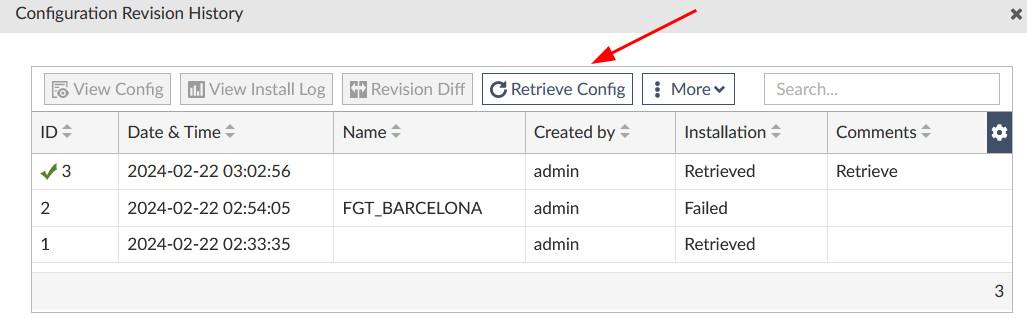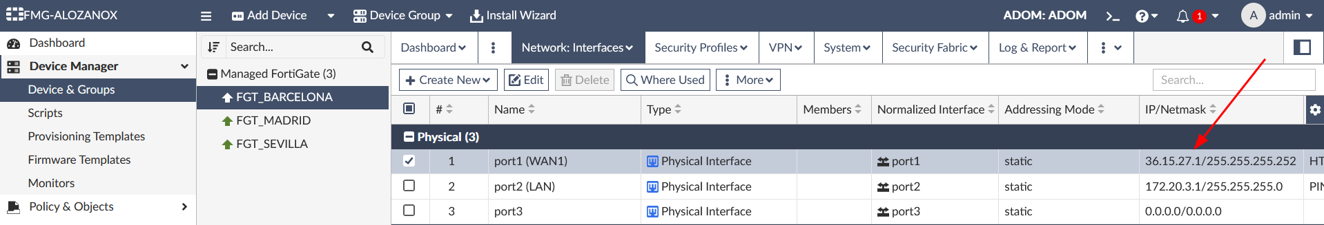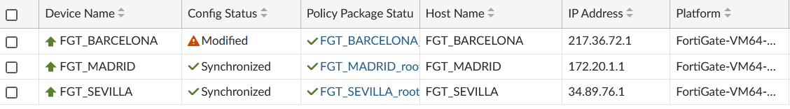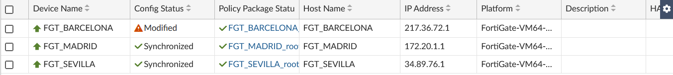 Como comentábamos, tras haber fallado la instalación volvemos a tener gestión del equipo pero la configuración seguirá estando como «Modified» en el FortiManager porque el cambio que hicimos anteriormente persiste en la base de datos. Deberemos corregir la IP o realizar un «Retrieve» del equipo para tener la configuración sincronizada.