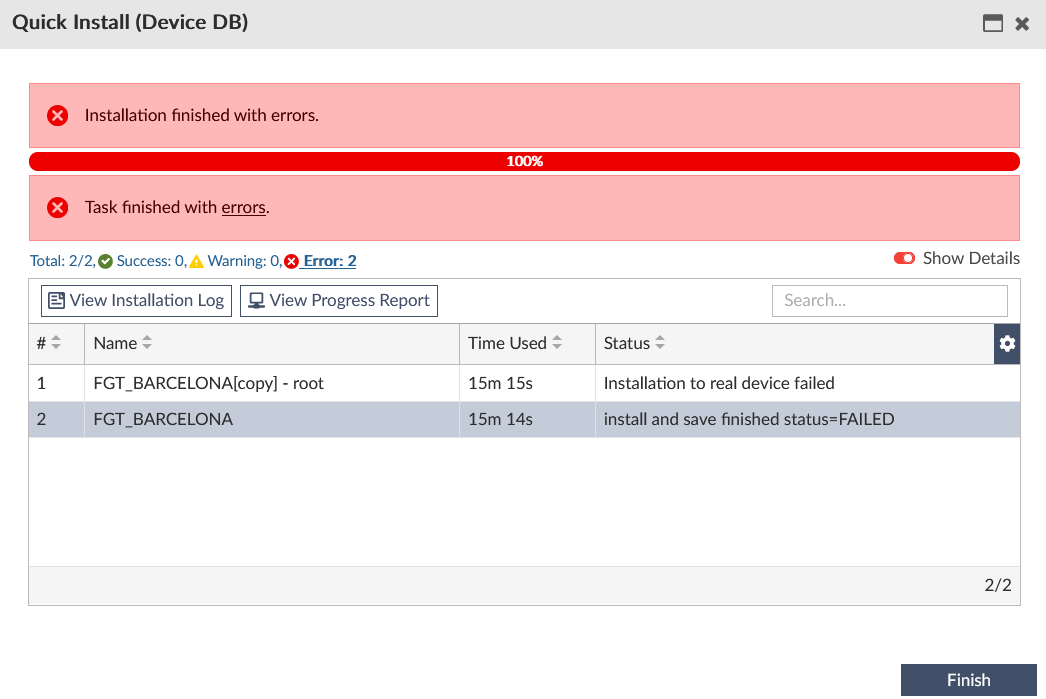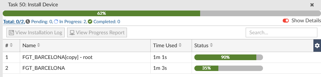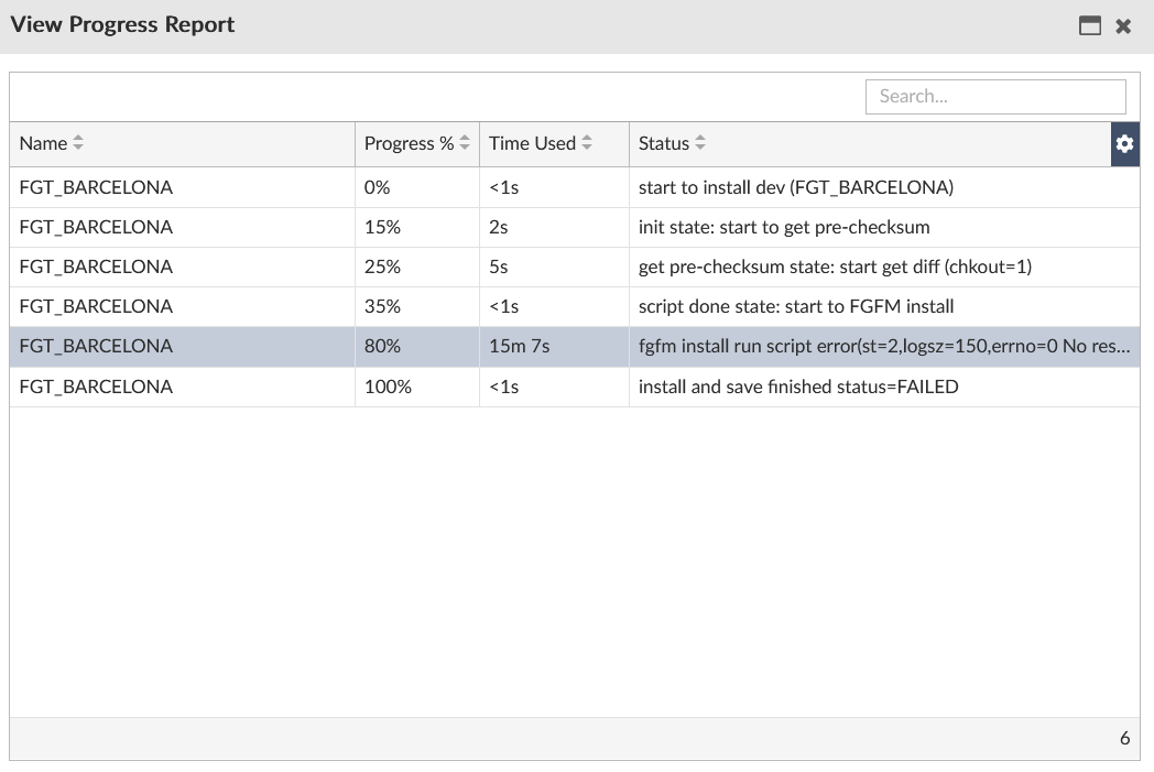 Si hacemos click sobre «View Progress Report» nos dará mas detalle de todo el progreso. Como no ha habido respuesta del FortiGate tras la modificación de la IP la instalación no se ha podido realizar de manera satisfactoria, de modo que en este momento se revierten los cambios aplicados en el equipo.