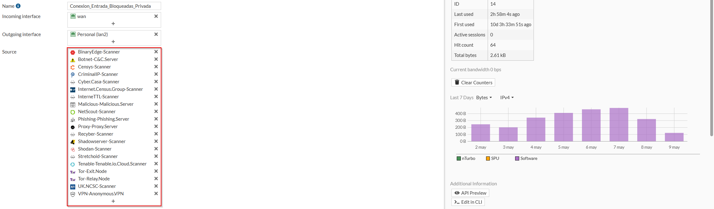 En esta entrada, abordamos una práctica esencial en la configuración de cortafuegos Fortigate: bloquear conexiones de entrada provenientes de fuentes maliciosas conocidas, orientadas a servicios abiertos que no deben estar accesibles desde el exterior.