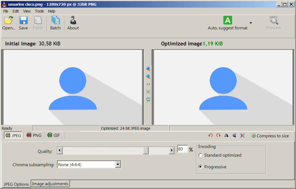 Como podemos comprobar, la imagen original tenía un tamaño de 30,58Kb y la imagen comprimida pesa 1,19Kb. Esta herramienta será muy útil para aquellas personas que gestionen una página web y no quieran que sus imágenes reduzcan la velocidad de su web.