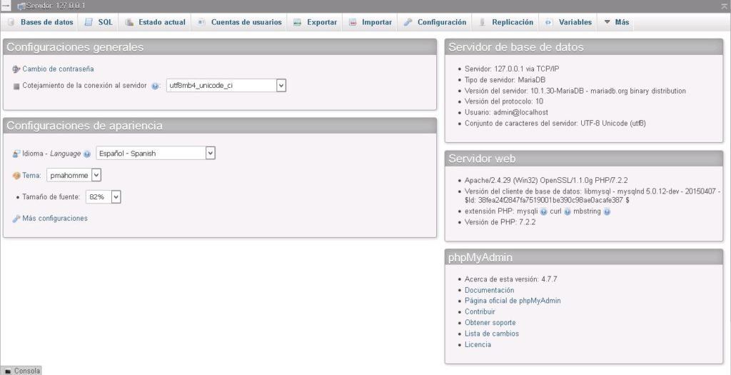 Una vez logados tendremos acceso al panel phpmyadmin con todos los privilegios que le hayamos configurado al usuario admin: