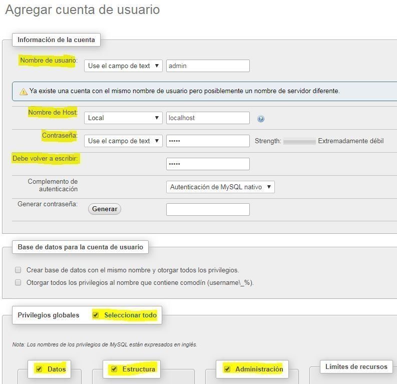 Lo primero que haremos será crearnos un usuario diferente para el acceso a phpmyadmin aunque este paso es opcional ya que podemos utilizar el usuario root: